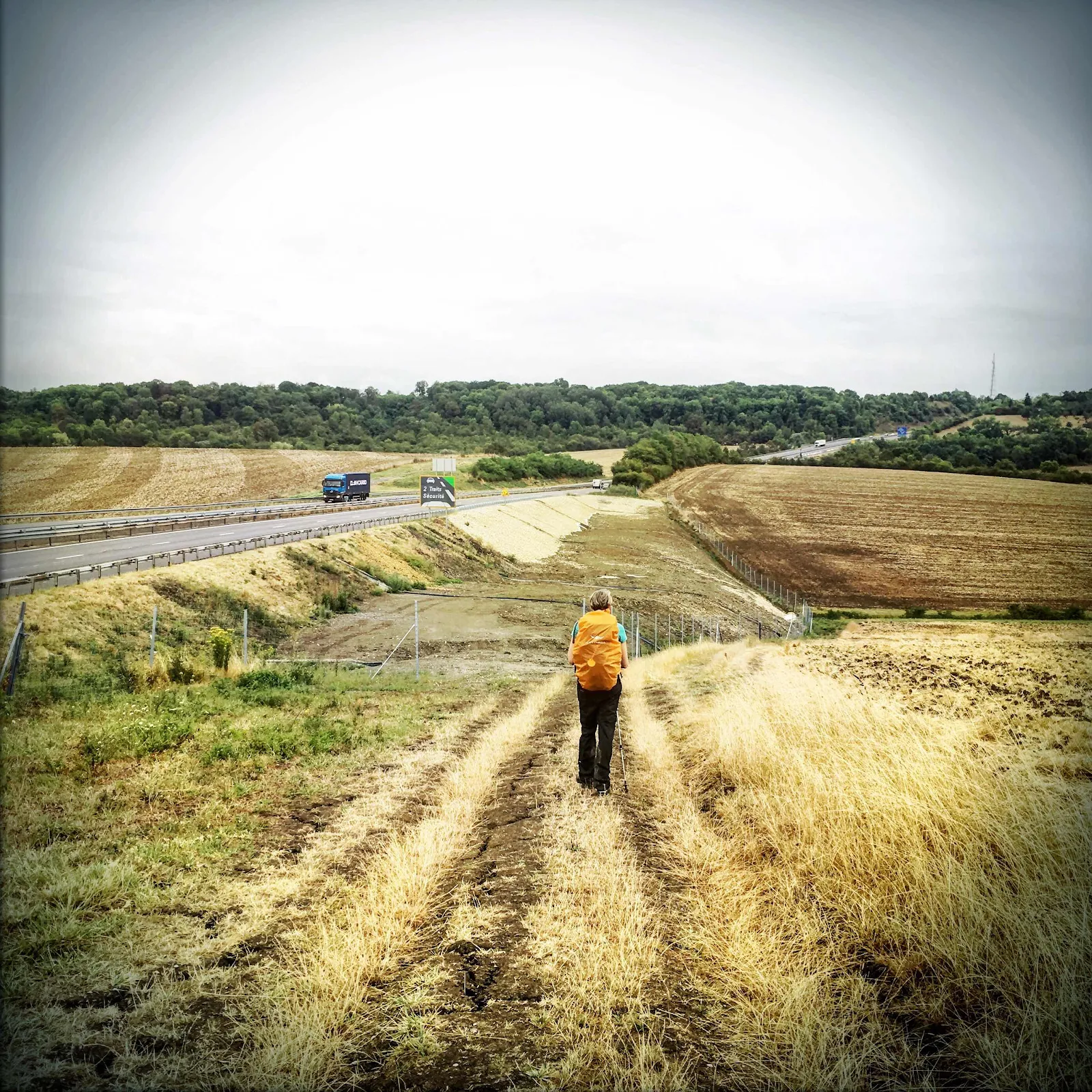 kauften in einer Bäckerei Proviant und setzen den Weg auf Feldwegen fort, durchquerten einen Wald und gewahrten die ersten Zivilisationsgeräusche. Bald überquerten wir eine Autobahn,