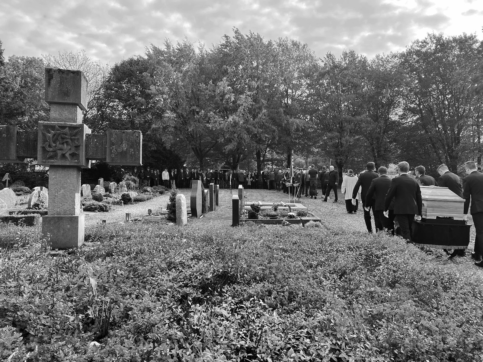Eine große Trauergemeinde kommt um 14.30 Uhr an der Friedhofskapelle in Elleringhausen zusammen. Die Schützenbruderschaft in großer Zahl in Reihe und mit Fahne. Ein polnischer Pfarrer hält die Trauerfeier. Mein Hirt ist Gott der Herr, vier Strophen. Auslegung Palm 23. Florián erinnert an seinen Opa. Humorvoll und treffende Worte. Applaus. Segne du Maria, 3 Strophen. Gang zum Grab. Abschied. Familie, die drei Brüder Josef, Clemens, Richard. Es ist ein milder Sommertag im Herbst. Haus Keuthen, Ausklang. Erinnerungen mit Familie und Weggefährten. Gabriel ist sogar aus Kanada gekommen.