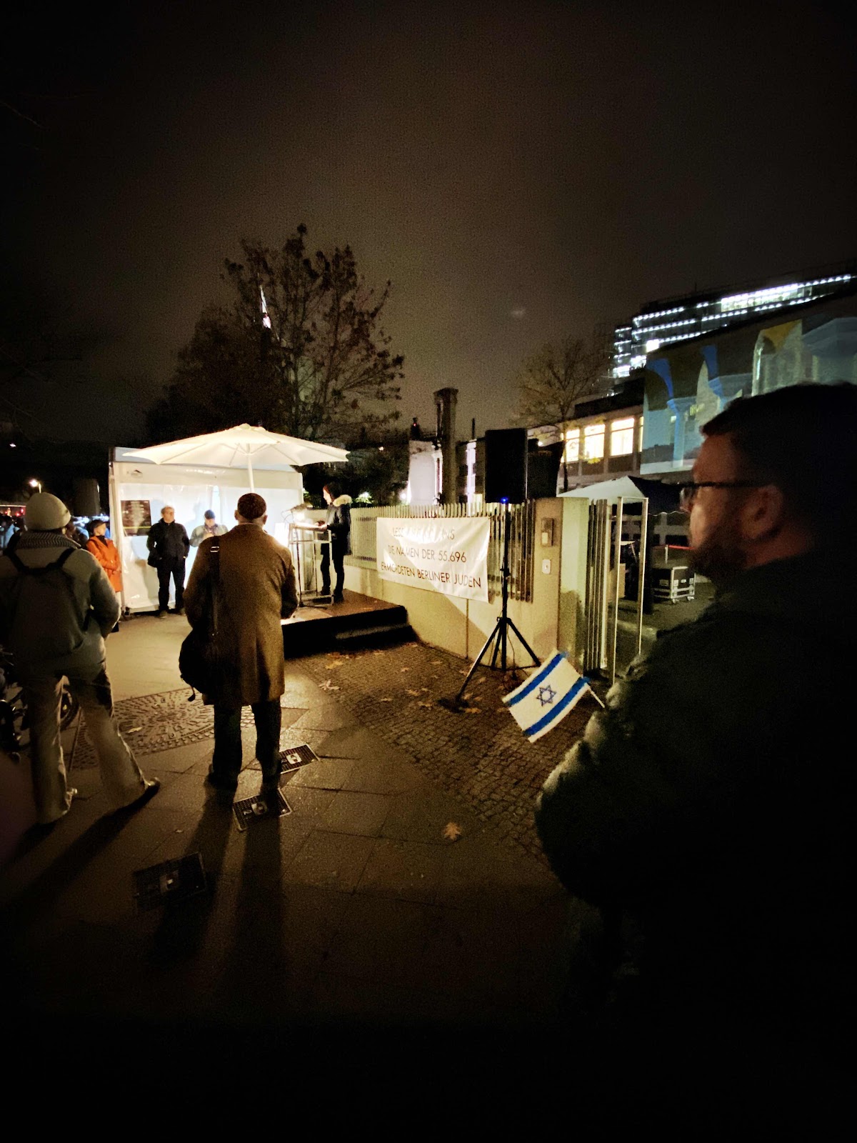 Der Antisemitismus scheint in allen Gesellschaftsschichten vertreten zu sein und bricht sich Bahn. An Abend des 9. November war das Gedenken in einer aufgeladenen Hauptstadt das naheliegenste. Schräg vor meinen Hotel wurden die Namen der über 55.000 ermordeten Berliner Juden verlesen. Ich fuhr noch zu weiteren Gedenkorten, Stille, Kerzen, Polizeisperren.