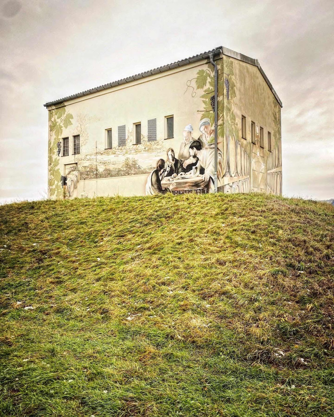 Am Morgen der Trauerfeier fahre ich mit dem Fahrrad die Elbe in Richtung Radebeul. Eine Scheune am Rand ist bemalt. Sie zeigt im weitesten Sinne die Emmaus – Szene. Ich bin sehr berührt, meine Lieblingspassage in der Bibel.