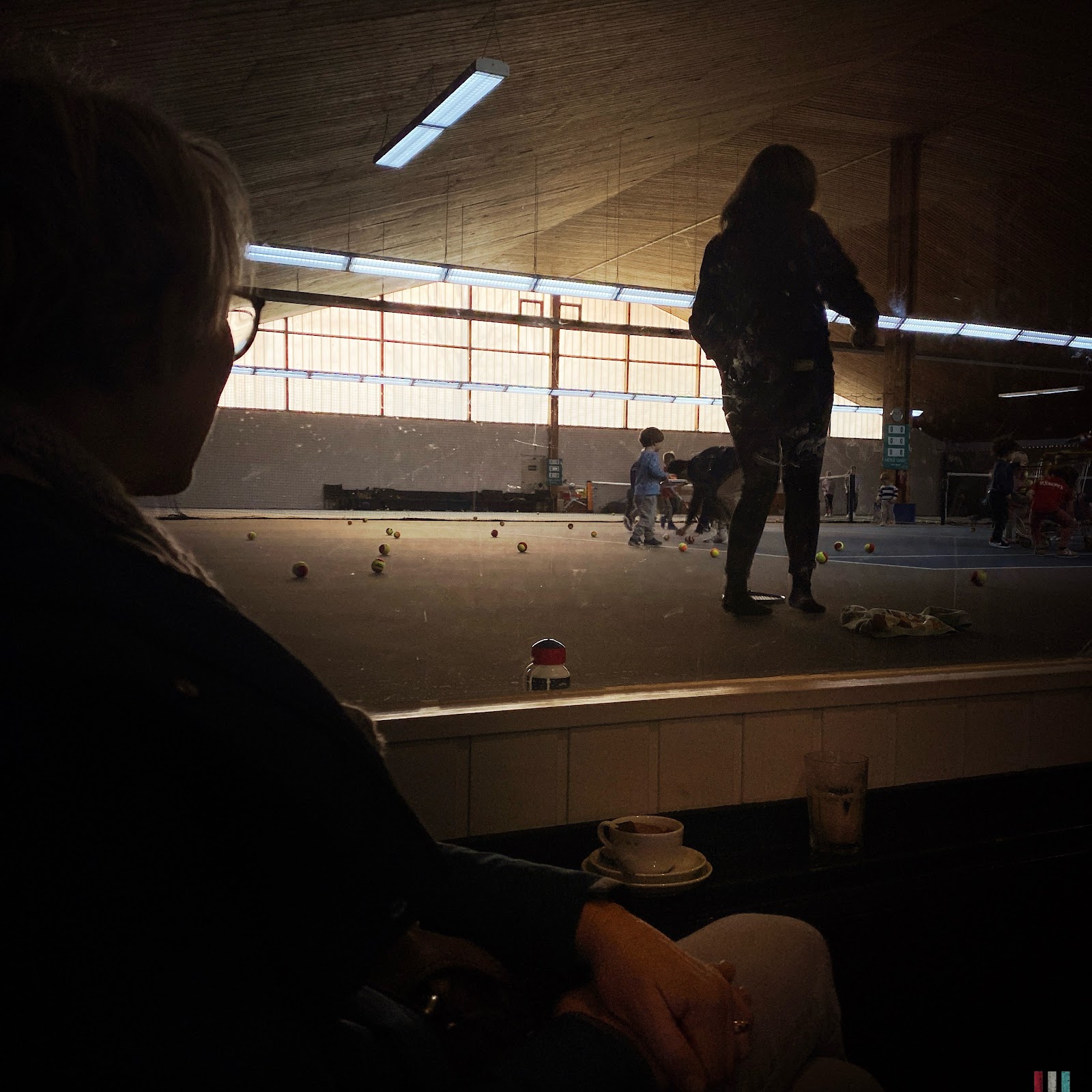 Auf zur Ballschule im örtlichen Tennisclub. Opa holt den Sport im Keller nach.