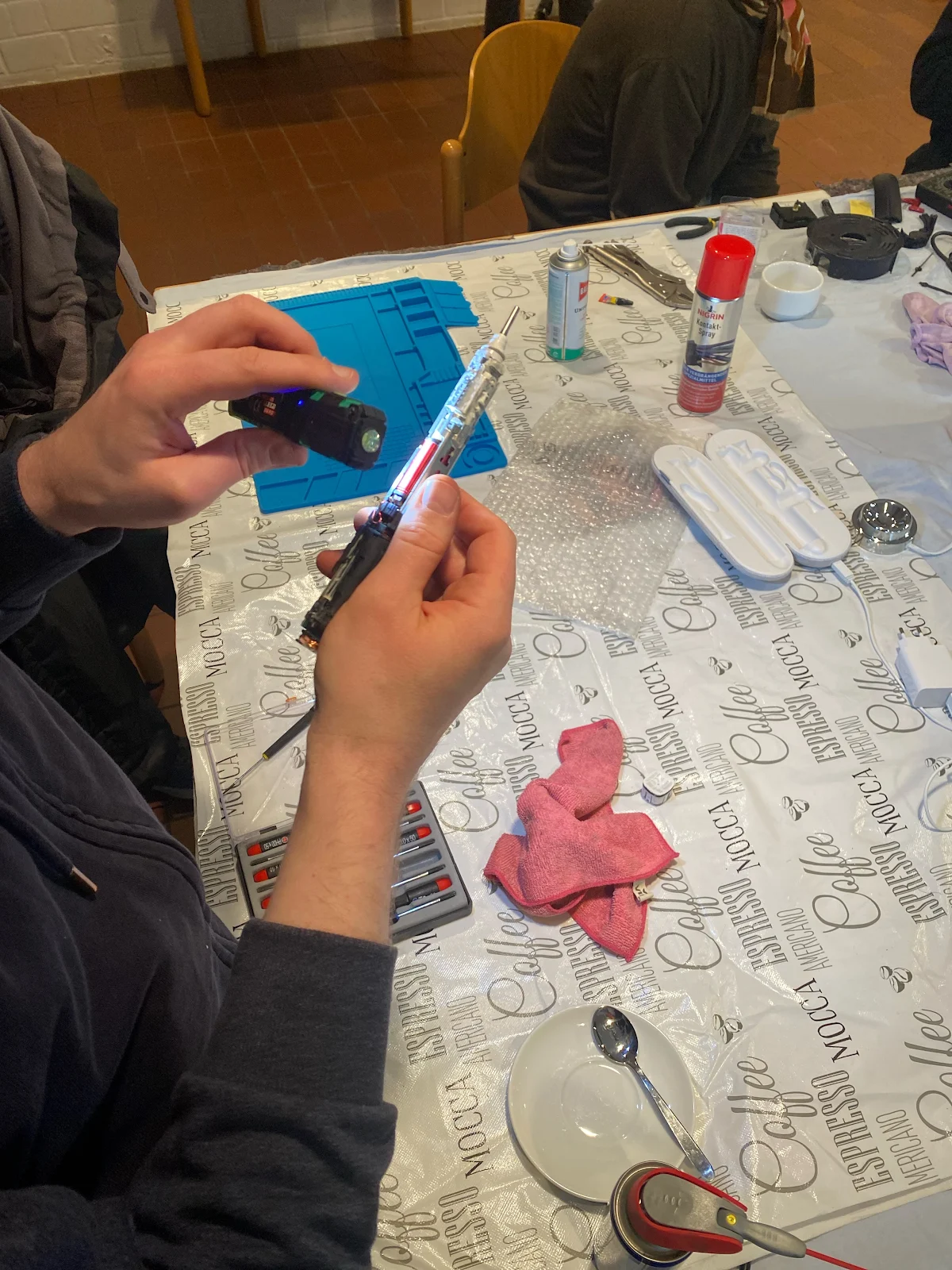 In der EU wurde jüngst eine Richtlinie erlassen, die ein Recht auf Reparatur festschreibt. Die RC-Bewegung gibt es schon viel länger und es zeigt sich, dass sich 90% der Elektrogeräte reparieren lassen. Auch die vierte Ausgabe findet großes Echo auf dem Venusberg. Ich arbeite natürlich in der Abteilung Rad, staune aber vor allem über die Kollegen bei der Kleinelektronik. Hier eine Ultraschallzahnbürste