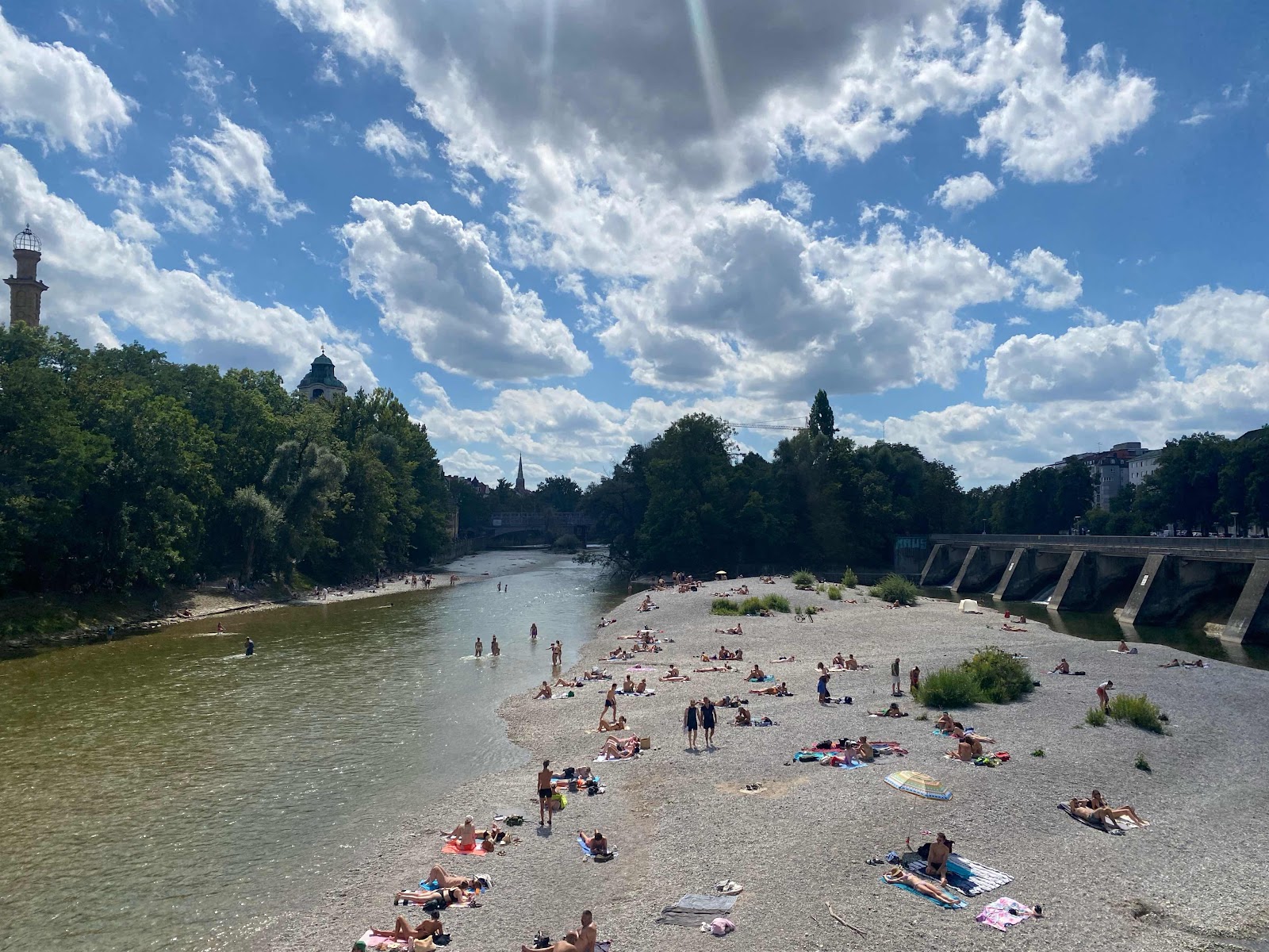 Der Münchner braucht keinen Strand. Statt Strand nimmt er den Stadtstrand. Auf 10 Kilometern Isar. Ein einziges Sonnenfest auf den weißen Kieseln.