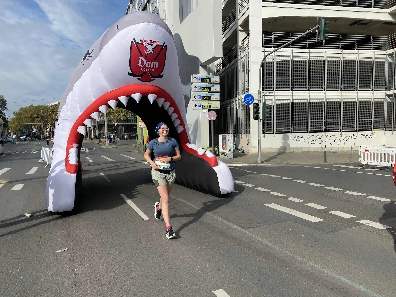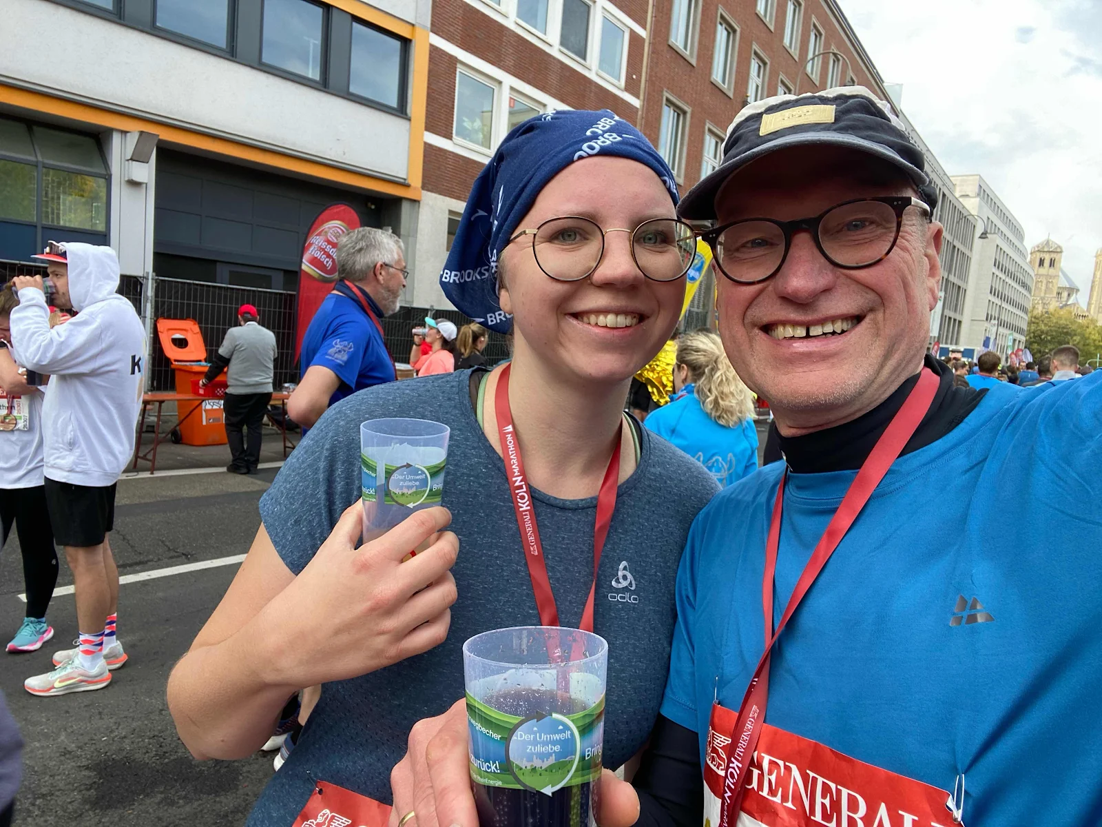 Über die Hohenzollernbrücke nach Deutz. Um 9:25 Uhr Start. Ruhiger Beginn. Gute Stimmung. Flottes Tempo, schneller als bei allen Trainingsläufen. Wir meandrieren durch die Stadt, über den Ring. Kommen auf die Luxemburger Straße. Die Luxemburger Straße. Wir schwenken ins Quartier Latäng. Treffen Bekannte auf der Berrenrather, mit Bruder und Ehefrau. Weiter zur Uni. Nach Lindenthal. Kurzer Schwenk am Verlag vorbei. Auf die Aachener Straße. Kleine Gehpausen, aber immer wieder flott unterwegs. Hinein in den Jubel am Rudolfplatz. Den Ring herunter, ins Belgische Viertel. Einen kleinen Bogen zur Moschee. Ab zum Mediapark, wieder auf den Ring. Der lange Weg zum Ziel. Auch hier und da noch einmal ein paar Gehpausen – nichts Dramatisches. Dann durch das Stadion. Durch den Rachen des Hais. Auf die letzten zwei Kilometer. Durch die Schildergasse, der Dom auf der rechten Seite. Schwenk auf die Zielgerade. Roter Teppich. Fertig. Welch ein Glück!